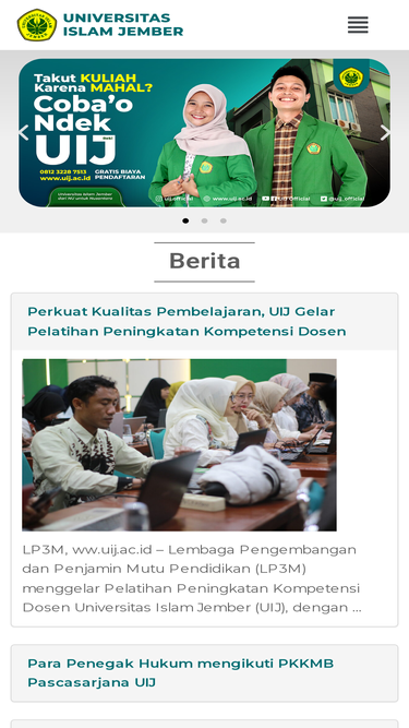59%Previous Next Berita Lebih Banyak Berita Pengumuman Lebih Banyak Berita Penerimaan Mahasiswa Baru Info PMB Pendaftaran Jadwal Penerimaan Penerimaan Mahasiswa Baru Pendaftaran Jadwal Penerimaan Info Grafis Universitas Islam Jember 100 Fakultas 100 Dosen 100 Program Studi 100 Doktor 100 Mahasiswa 100 kampus Media Sosial Official Facebook Twitter Youtube Instagram Tiktok