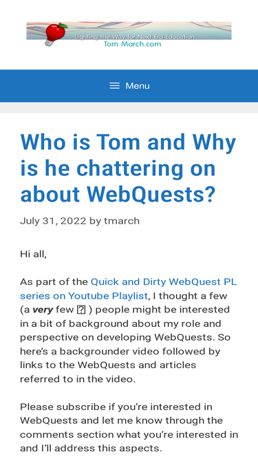 84%Tom March develops WebQuests & Learning Activities Bernie Dodge and Tom March have been working since early 1995 to develop the WebQuest as one strategy for effectively integrating the Web into classroom instruction. This page gathers Tom’s work in creating and teaching WebQuests. Look to Bernie’s The WebQuest Page for a huge selection of WebQuest ... Read more