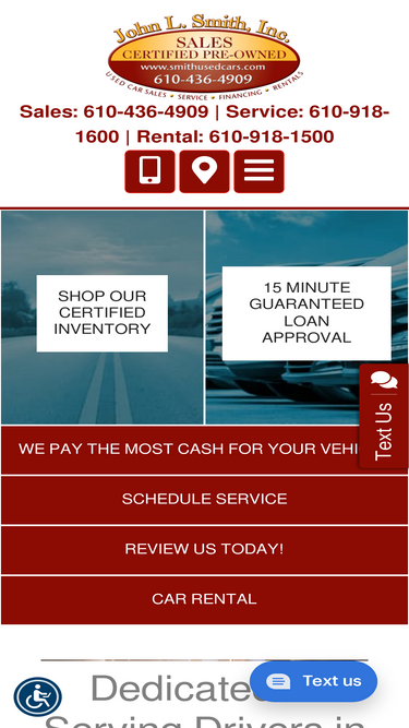 94%Welcome to John L. Smith, Inc Used Cars! Thank you for voting John L Smith Inc the #1 Preowned Car Dealer in Chester County. We are the largest used car and truck dealer in West Chester, PA. Our sales staff would be pleased to show you our inventory of vehicles priced from $10,000-$25,000. Every vehicle is state inspected and guaranteed. At John L. Smith, Inc., we take great pride in the vehicles we sell and the quality of customer service given before and after purchasing your automobile. John L. Smith, Inc. has been in business for more than 40 years. In addition to our Sales department, we are proud of our outstanding Detail department. We have added a Rental Car Company on the premises for the benefit of you, the customer. For us customer satisfaction is not just a catch phrase, but our way of life. I want your visit to be both enjoyable and informative. Please call us at 610-436-4909 to arrange a test drive or visit our website www.smithusedcars.com to view our complete inventory.