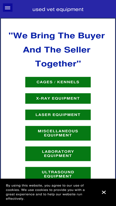 Used veterinarian equipment for sale. Cages and Kennels. Digital X-Ray. Ultrasound. Laboratory equipment. Vehicles and Vet Boxes. Surgery and Lasers. Tables, Sinks and Scales. "We bring the buy and the seller together."