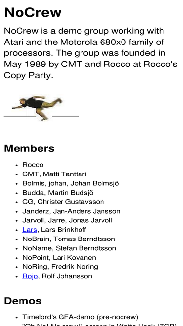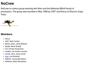 63%nocrew is an atari demo group founded in may 1989 by cmt and rocco at rocco's copy party.