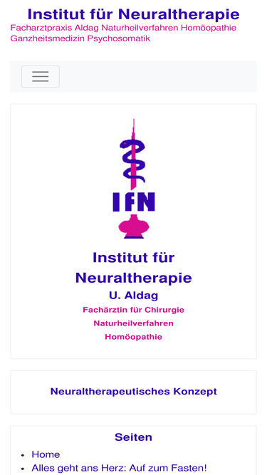 Institut für Neuraltherapie Facharztpraxis Aldag In dieser naturheilkundlichen Arztpraxis wird ganzheitlich vorgegangen, denn Geist-Körper und Seele sind untrennbar. Jede Erkrankung ist psychosomatisch! Nur therapeutisch ist es von Belang, ob auf mentaler, emotionaler oder körperlicher Ebene behandelt wird. Auf der Basis der Schulmedizin wird hauptsächlich behandelt: neuraltherapeutisch-naturheilkundlich klassisch homöopathisch alternativ-komplementärmedizinisch psychosomatisch und physiotherapeutisch