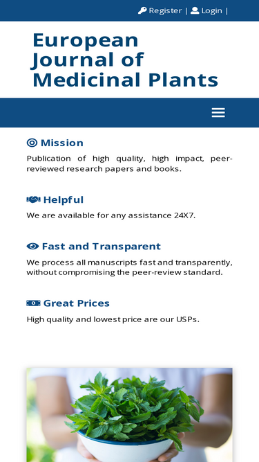 58%european journal of medicinal plants (issn: 2231-0894) is dedicated to publish high quality papers (click here for types of paper) in all areas of medicinal plants research including plant growth and development, agronomic management, plant nutrition, plant physiology, cell biology, molecular biology, biotechnology, medicinal properties, phytochemical constituents, fitoterapia, pharmacognosy, essential oils, ehnopharmacology and phytomedicine. the journal also encourages the submission of useful reports of negative results. this is a quality controlled, open peer reviewed, open access international journal.