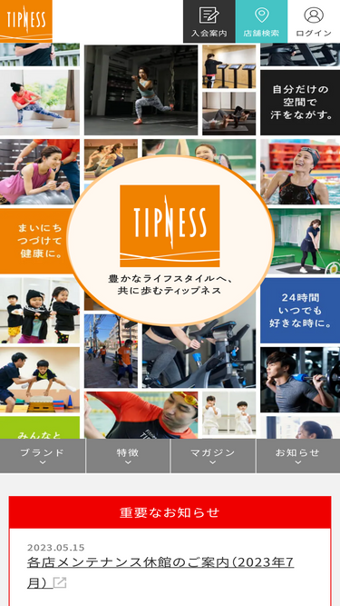 93%フィットネスクラブ「ティップネス」「ティップネス・キッズ」「ファストジム24」「ティップネス丸の内スタイル」オンラインフィットネス「トルチャ」などを運営する株式会社ティップネスの公式ホームページです。企業理念や各ブランドの情報、各店舗の所在地などをご案内しています。