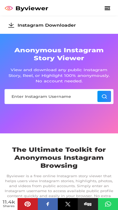88%View and download any public Instagram story, profile, or post 100% anonymously. With Byviewer, it's ✅ 100% Free & Fast and ✅ No Login Required!