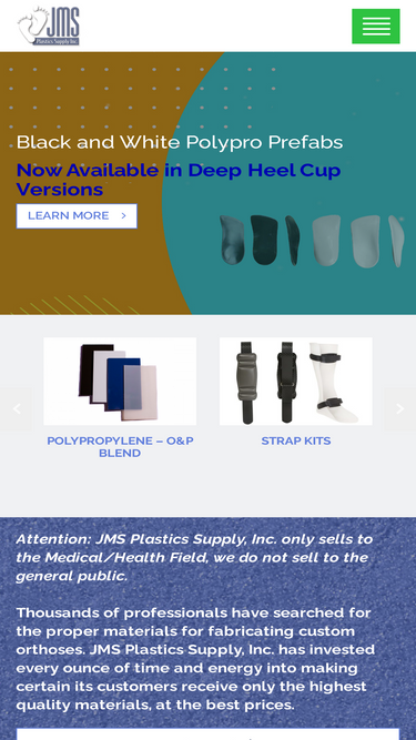 30%Thousands of professionals have searched for the proper materials for fabricating custom orthoses. JMS Plastics Supply, Inc. has invested every ounce of time and energy into making certain its customers receive only the highest quality materials, at the best prices.