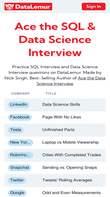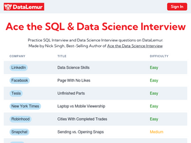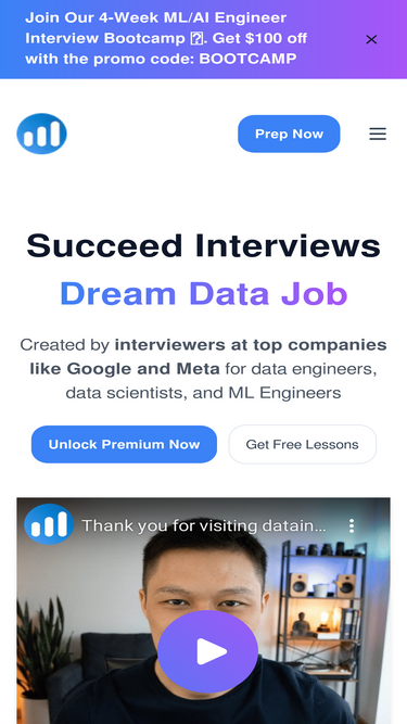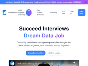 70%Ace your data science, analytics, ML/AI engineer, and data engineer interviews with Datainterview.com. Practice real interview questions, break into top-tiered companies, startups, and consulting firms.