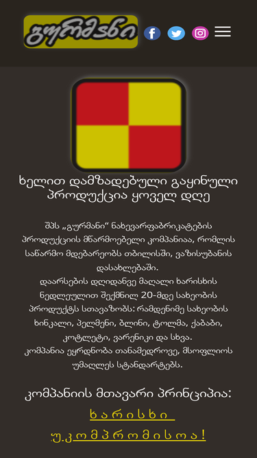 ხელით დამზადებული გაყინული პროდუქცია ყოველ დღე შპს „გურმანი“ ნახევარფაბრიკატების პროდუქციის მწარმოებელი კომპანიაა, რომლის საწარმო მდებარეობს თბილისში, ვაზისუბანის დასახლებაში. დაარსების დღიდანვე მაღალი ხარისხის ნედლეულით შექმნილ 20-მდე სახეობის პროდუქტს სთავაზობს: რამდენიმე სახეობის ხინკალი, პელმენი, ბლინი, ტოლმა, ქაბაბი, კოტლეტი, ვარენიკი და სხვა. კომპანია ეყრდნობა თანამედროვე, მსოფლიოს უმაღლეს სტანდარტებს. კომპანიის მთავარი პრინციპია: ხ ა რ ი ს ხ ი უ