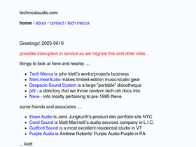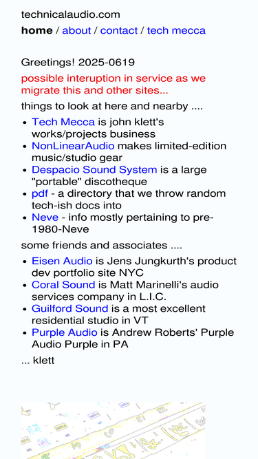 technicalaudio.com has useful information relating to various technical aspects encountered in music and sound recording and production. there are links to some companies and people who often work together building and maintaining various gear and infrastructures that support these activities. this site would probably be at least marginally interesting to anyone working in music recording, production, and sound design as artists, producers, and engineers as well as studio techs and those doing audio diy