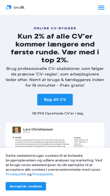 74%Gratis online CV-bygger, som lader dig oprette et perfekt CV på få minutter. Se hvor let det er at oprette et fantastisk CV og sende ansøgninger i dag!