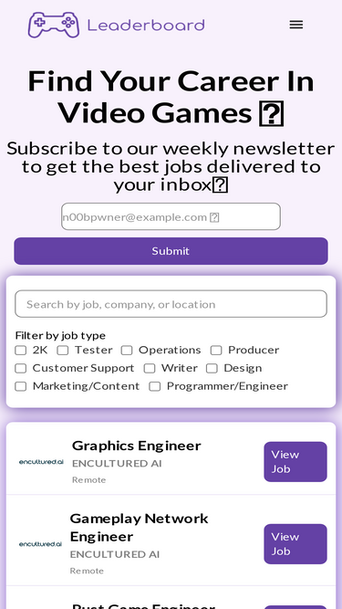 100%Looking to get a sweet job with a video game company? Leaderboard Jobs is the best place to search for & apply for jobs in the video game industry. Learn more!