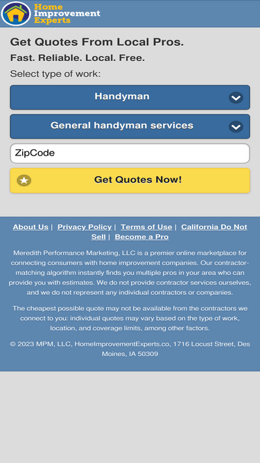home improvement experts offers free quotes from local, reliable contractors in just minutes. more than 1 million people have trusted our service to save big on their next home improvement, repair, or maintenance project. get started now and connect with top handymen, plumbers, electricians, remodelers and more!