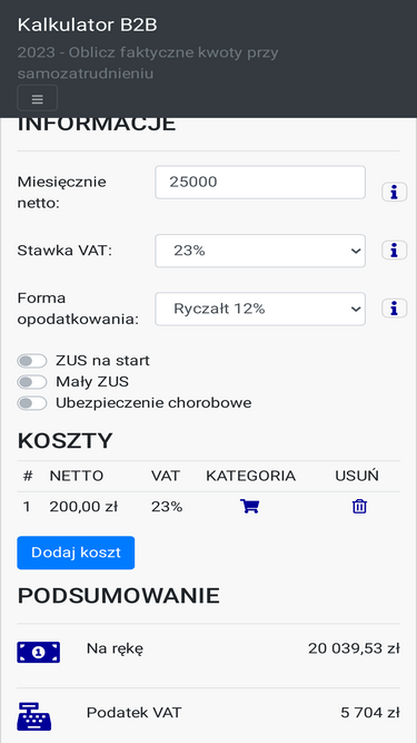 78%Darmowy kalkulator B2B dla samozatrudnionych na 2026 rok. Oblicz składki ZUS, podatek dochodowy (Ryczałt, Liniowy, Skala) oraz realny zysk netto "na rękę".
