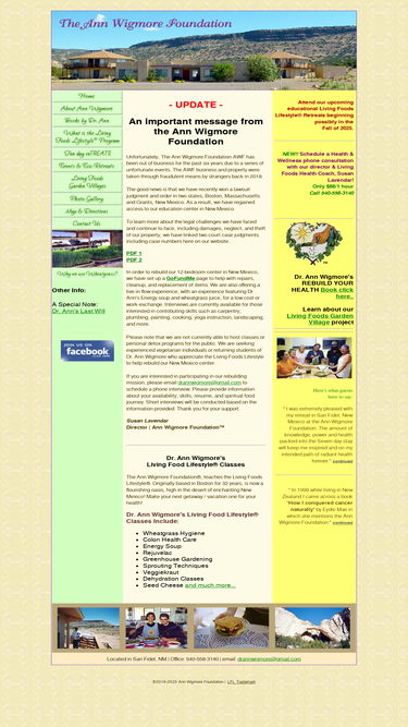 88%dr. ann wigmore's living foods lifestyle® goes beyond a raw foods detox diet. it involves organic, fresh, uncooked fruits, vegetables, nuts and seeds, and dehydrated foods. and, of course, dr. wigmore's legacy - the power of wheatgrass. classes are offered in digestive wellness, wheatgrass, sprouting, raw and living food preparation, wheatgrass hygiene, colon health care, energy soup, rejuvelac, greenhouse gardening, sprouting techniques, veggiekraut, seed cheese, and dehydration. call 505-414-9796 to learn more or book your visit.