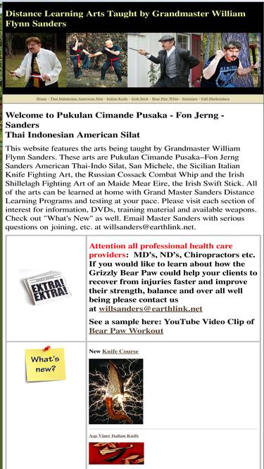 83%martial arts taught by grandmaster william flynn sanders. these arts are pukulan cimande pusaka sanders american pencak silat, san michele, sicilian italian knife fighting art, the russian cossack combat whip and the irish shillelagh fighting art of an maide mear eire, the irish swift stick. all of the arts can be learned at home with grand master sanders distance learning programs and testing at your pace. books, dvds, training material and weapons are avaiable.