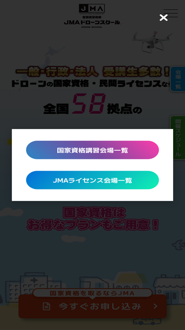30%登録講習機関JMAドローンスクールでは、一等・二等無人航空機操縦士の基本、昼間飛行の限定解除、目視内飛行の限定解除、最大離陸重量25kg未満限定解除の講習が全国のJMAドローンスクールの会場で受講が可能です。 全国包括申請込のJMA認定パイロット養成コース、農薬散布教習、ICTドローン導入コースもご用意しております。