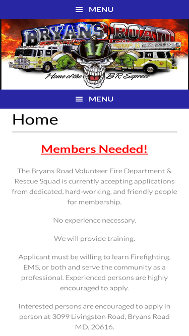 100%Bryans Road Volunteer Fire Department, is located at 3099 Livingston Rd Bryans Road, MD 20616. For emergencies dial 911, non emergencies dial 301-375-7055.