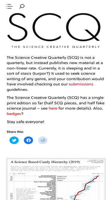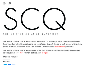 The Science Creative Quarterly (SCQ) is not a quarterly, but instead publishes new material at a non-linear rate. Currently, it is sleeping and in a sort of stasis (turpor?) It used to seek science writing of any genre, and your contribution would have involved checking out our submissions guidelines. The Science Creative Quarterly (SCQ) has