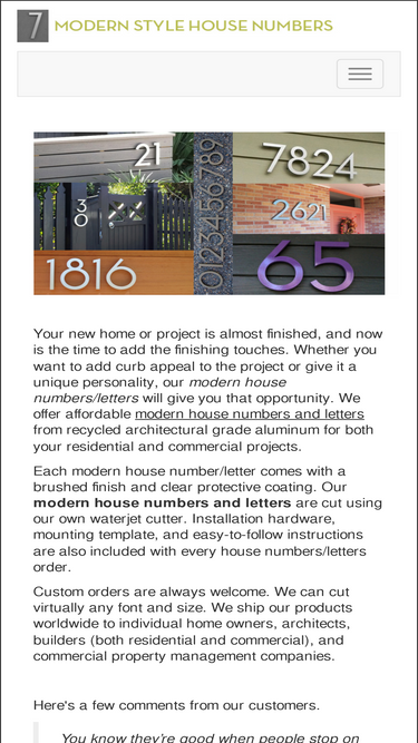 98%modern dwell house numbers - offering quality house numbers and letters made from recycled architectural grade aluminum for both residential and commercial applications. each house number / letter has a brushed finish with a clear protective coating that will withstand extreme weather conditions. all our house numbers and letters are cut using our own waterjet. installation hardware, mounting templates, and easy to follow instructions are all included with every order. custom orders are always welcome. we can cut almost any font and size. we've shipped our product worldwide to individuals, architects, builders (both residential and commercial) and commercial property management companies.