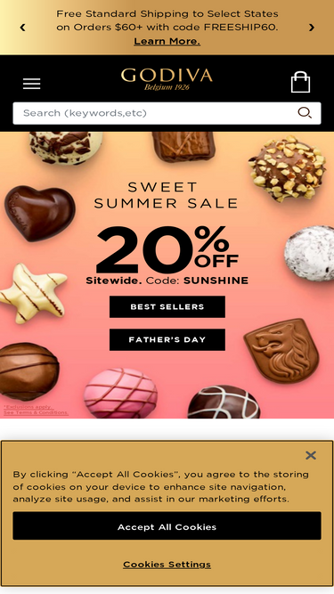 Free Standard Shipping on Orders $50-$599 Use code FREESHIP70 at checkout on GODIVA.com to receive Free Standard Shipping on qualifying orders of $50+. Only valid on orders shipping in the continental U.S. Any shipment that does not meet the qualifying purchase threshold will incur applicable shipping charges. Not vali