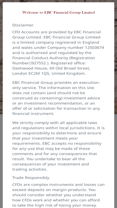 64%ebc financial group limited is a limited company registered in england and wales under company number 12503674 and is authorised and regulated by the financial conduct authority (registration number:927552 )