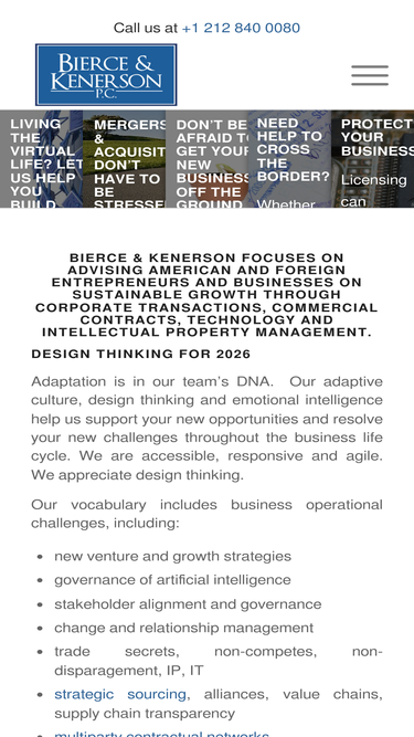 Bierce & Kenerson focuses on advising American and foreign entrepreneurs and businesses on sustainable growth through corporate transactions, technology and IP.