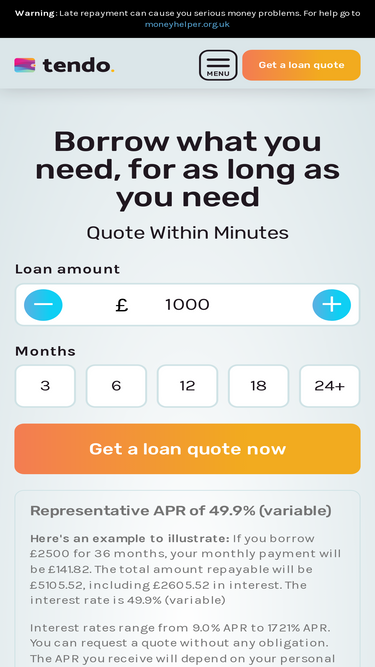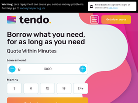 73%tendo is a credit broker. our free quoting service compares more than 50 lenders within a matter of minutes. warning: late repayment can cause you serious money problems. for help go to moneyhelper.org.uk