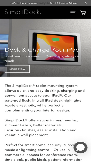 87%The SimpliDock® tablet mounting system allows quick and easy docking, charging and convenient access to your iPad®. Our patented flush, in-wall iPad dock highlights Apple's aesthetic, while perfectly complementing your interior design. SimpliDock® offers superior engineering, slimmer bezels, better materials, luxurious finishes, easier installation and versatile wall placement. Perfect for smart home, security, surveillance, music or lighting control. Or use in commercial spaces for conference room, time clock, public kiosk, patient information, etc. Combine the SimpliDock® with your favorite iPad® app for an unbeatable touchscreen control solution that's always within reach! Sleek, minimalist design showcases iPad® and looks like it belongs in your home or business. Simple docking and charging. Eject iPad® in seconds by pressing firmly Option for installing with "Fixed Adapter" to prevent easy removal In-wall flush mount or surface mount as needed Mounts portrait or landscape Built-in Lightning® connector extends power inside wall. Works with any standard iPad charger. Compatibility Works with the following iPad models: Name Year Model Number(s) iPad® (5th Generation) 2017 A1822 A1823 iPad® (5th Generation) 2018 A1893 A1954 iPad® (7th Generation) 2019 A2197 A2200 A2198 iPad® (8th Generation) 2020 A2270 A2428 A2429 A2430 iPad® (9th Generation) 2021 A2602 A2604 A2603 A2605 iPad® Pro (10.5-inch) 2017 A1701 A1709 A1852 Installation Ultra-thin depth <1/2" design means you don't have to worry about stud finding or placement concerns. In fact, installation is easier if there is a stud behind the mounting location - Simply cut the hole and screw to existing wood framing. Or, if the wall opening is hollow, we include four clamping brackets that grasp wall surfaces from 1/8" to 3/4". Or, if you'd rather not cut out the wall, then mount to the surface instead. Simply drill a hole for the charging cables,
