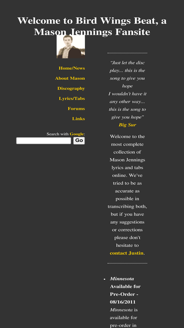 80%Birdwingsbeat.com is a comprehensive Mason Jennings fansite that contains lyrics, tabs, discography, news, links and a fan forum.