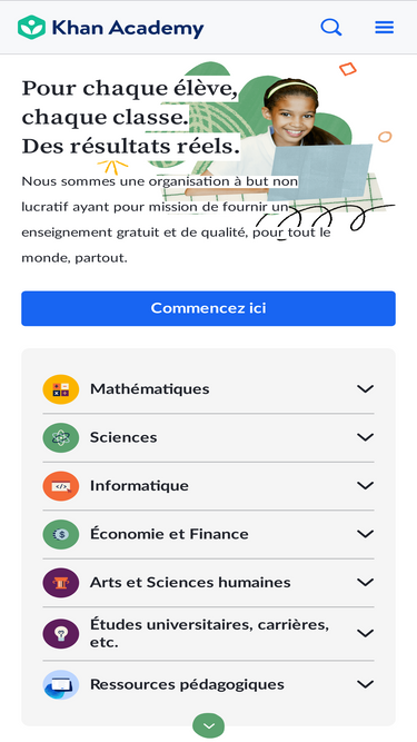 Apprenez gratuitement les Mathématiques, l'Art, la Programmation, l'Economie, la Physique, la Chimie, la Biologie, la Médecine, la Finance, l'Histoire et plus encore. Khan Academy est une ONG qui a pour mission d'offrir un enseignement gratuit et de qualité, pour tout le monde, partout.