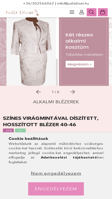 98%"V" nyakú, 3 gombos, zsebes, 3/4 ujjú, bársonyos tapintású alkalmi blézet. 2-3 cm-t enged. Méret /külső/ /cm/ Hossz Mell Derék Csípő XL 69 112 108 118 2XL 69 116 112 122 3XL 69 124 122 132 4XL 69 126 124 138
