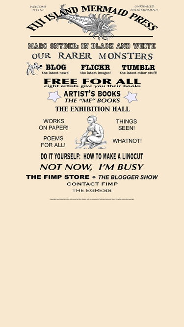 96%the fiji island mermaid press presents fine art and artists books, featuring the work of marc snyder and marti haykin. the site contains original artist's books, prints, drawings, and other works on paper.