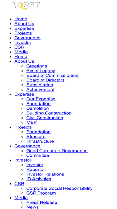 72%PT Acset Indonusa Tbk (IDX: ACST) is a prominent construction company in Indonesia that provides integrated construction services with high safety and quality standards. Since its establishment in 1995, ACSET has been forging its specialties in foundation and demolition works. Today, ACSET provides a set of integrated construction services, ranging from demolition, foundation, high-rise structure, and infrastructure; providing our customers with an end-to-end construction services solution. Through many years, ACSET continuously diversifies its expertise, including its most recent expertise, soil improvement works, which cover land and marine soil improvement. Both of these works are done through cement deep mixing method. While land soil improvement does not require additional tools, marine soil improvement requires barge as the main instrument to complete this work. Through ACSET Sea I, Indonesia’s first Cement Deep Mixing Barge (CDM Barge), which ACSET currently owns, the Company is broadening its capabilities even more. ACSET is on the roadmap to become the largest private construction company by 2020. Today, ACSET is a member of PT Astra International Tbk, one of Indonesia’s largest business groups, through its subsidiary, PT United Tractors Tbk.