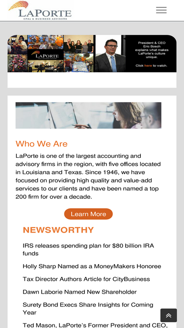 97%LaPorte is one of the largest audit, tax, and consulting firms with over 190 personnel in New Orleans, Houston, Baton Rouge, Covington, and Houma.