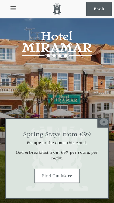 Located on Bournemouth’s East Cliff, the Hotel Miramar overlooks the bay, with spectacular views from the Needles in the east to Old Harry Rocks in the west.