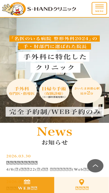 92%埼玉県さいたま市、さいたま新都心駅徒歩2分のS-HANDクリニックは名医に選ばれた手の外科専門医が日帰り手術も行う手や手の指専門の整形外科です。完全予約制