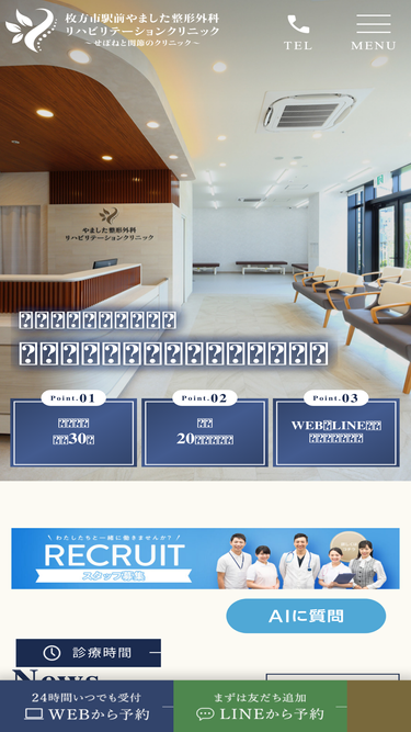 88%枚方市駅近くの「枚方市駅前やました整形外科リハビリテーションクリニック~せぼねと関節のクリニック~ 」は土曜日も診療しています。整形外科/小児整形外科/スポーツ整形外科/ リハビリテーション科/リウマチ科/外科/インソール外来/交通事故・労災に対応していますので、お気軽にご相談ください。