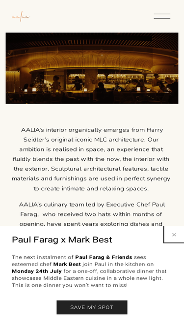 89%Whether it's a corporate event or any banquet, find your ideal venue at AALIA's private dining room and restaurant venue in Sydney. Enquire today.