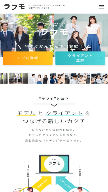 82%クライアント会員登録|本業がモデルの方から主婦の方まで、幅広いモデルが活躍。ラフに撮影活動をしたいモデルと直接モデルを起用したいクライアントをつなぐ、安心安全のマッチングサービスです。