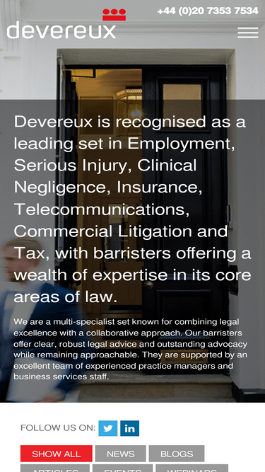 devereux is one of the uk's top civil and commercial sets with barristers offering a wealth of expertise in our core areas of law: commercial litigation, employment, insurance, personal injury & clinical negligence and tax. we are known for combining legal excellence with a modern and collaborative approach. our barristers combine clear and robust legal advice with outstanding advocacy while remaining approachable. they are supported by an excellent team of experienced practice managers and business services staff.