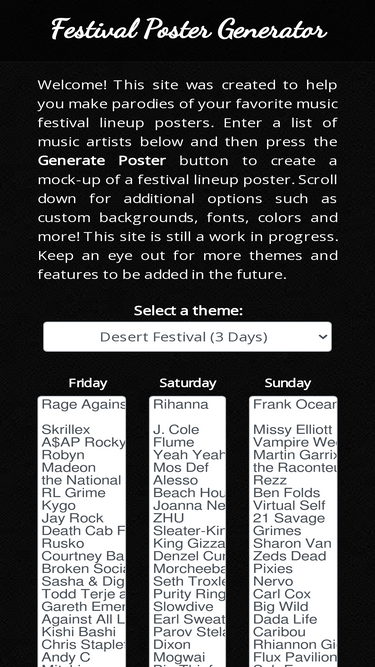 enter a list of music artists to create a realistic mock-up of a music festival lineup poster.