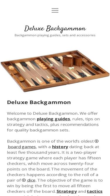 87%welcome to deluxe backgammon. we offer backgammon playing guides, rules, tips on strategy and tactics, plus recommendations for quality backgammon sets.