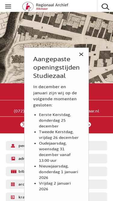 97%Lees ook het uitgebreide bezoekersreglement. Legitimeren U kunt onze studiezaal kosteloos bezoeken en de daar aanwezige stukken inzien. Als u originele archiefstukken en bibliotheekwerken aanvraagt, vragen wij u om zich eenmalig legitimeren en registreren. Neem hiervoor een geldig legitimatiebewijs mee. In de studiezaal Wij verzoeken u uw jassen, tassen en etenswaren niet mee te nemen in de studiezaal. Voor het opbergen van tassen en waardevolle spullen zijn voldoende gratis kluisjes beschikbaar bij de centrale receptie. Laptops en fototoestellen mogen op de studiezaal gebruikt worden . Er zijn voldoende stopcontacten. Op de meeste werkplekken is ook een internetaansluiting aanwezig. Er is gratis wifi, vraag bij de balie naar het wachtwoord. De bezoekers van de studiezaal willen graag in rust werken. Graag uw mobiele telefoon en eventueel digitale camera op stil zetten. Dronken of onder invloed van drugs de studiezaal betreden is niet toegestaan. Camerabewaking Op de studiezaal is cameratoezicht aanwezig. Dit dient ter ondersteuning van de toezichtfunctie van het baliepersoneel. Tevens wordt gelet op uw eigendommen; steeds meer mensen nemen namelijk de laptop mee naar de studiezaal. Daarbij geldt uiteraard wel dat u zelf de verantwoordelijkheid houdt voor het beheer ervan. De opnamen van de camera's worden na verloop van tijd gewist. Raadplegen van bronnen In de studiezaal kunt u de belangrijkste genealogische bronnen in zelfbediening raadplegen. Ook is het mogelijk originele stukken, voor zover deze niet in gekopieerde vorm in de studiezaal staan opgesteld, aan te vragen. Het aanvragen gebeurt via de website, eventueel kunt u thuis al uw aanvragen doen. Er gelden verschillende procedures voor de aanvraag van archiefstukken, bibliotheekwerken en objecten uit de beeldcollecties. Het raadplegen van de in het Regionaal Archief Alkmaar bewaarde archieven en collecties is kosteloos. Voor verdere dienstverlening worden wel tarieven in rekening gebracht. Punten van aanda