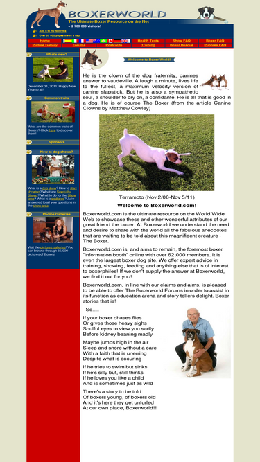 77%boxerworld.com is the ultimate resource on the world wide web to showcase these and other wonderful attributes of our great friend the boxer dog. at boxerworld we understand the need and desire to share with the world all the fabulous anecdotes that are waiting to be told about this magnificent creature - the boxer.