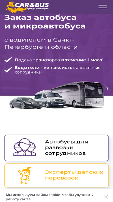 79%Заказать автобус, микроавтобус, автомобиль с водителем. Так же заказ автобуса для перевозки сотрудников в Санкт-Петербурге и Ленинградской области. Штатные водители, подача автобуса через 1 час. Удобная услуга: заказ автобусов онлайн - цены на сайте актуальны. Транспортные услуги от компании Car&Bus (КарБас).
