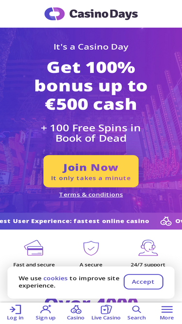 96%Play at Casino Days for a wide range of exciting games, attractive bonuses, secure payments, fast withdrawals, and dedicated 24/7 support.
