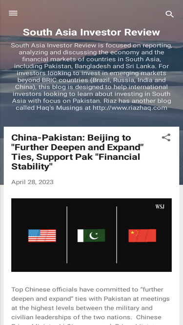 77%South Asia Investor Review is focused on reporting, analyzing and discussing the economy and the financial markets of countries in South Asia, including Pakistan, Bangladesh and Sri Lanka. For investors looking to invest in emerging markets beyond BRIC countries (Brazil, Russia, India and China), this blog is designed to help international investors looking to learn about investing in South Asia with focus on Pakistan. Riaz has another blog called Haq's Musings at http://www.riazhaq.com