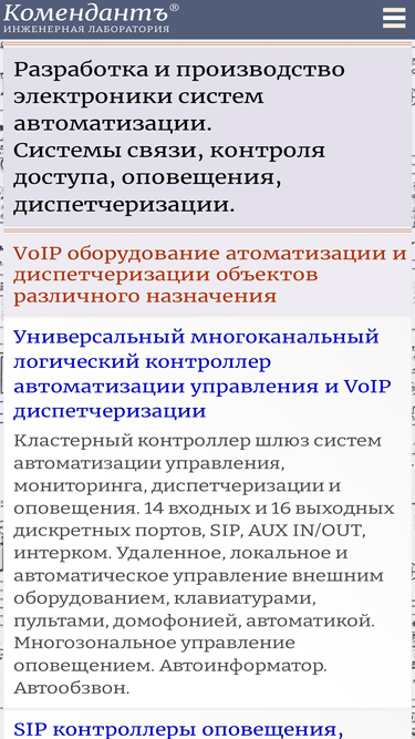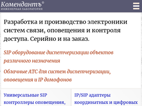 85%разработка и производство электроники voip систем связи, диспетчеризации, оповещения и контроля доступа. серийно и на заказ. универсальные sip контроллеры оповещения и громкой связи, ip/sip адаптеры домофонов, ip системы контроля доступа, sip и телефонные домофоны, ip/sip системы оповещения. облачные атс для систем диспетчеризации, оповещения и ip домофонов. москва, компания атсн, komendant.pro ru400116tm.