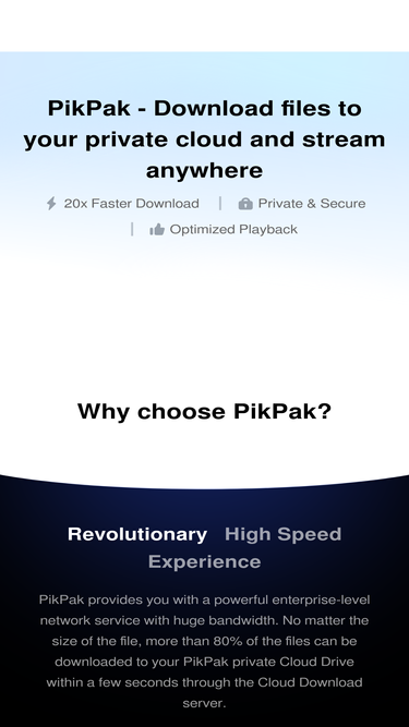 PikPak is a private and safe cloud drive that can save links from Torrent / Magnet / Social Media with 20X faster download and support 4K videos for original quality online playback.