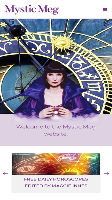 86%Mystic Meg is Britain's most iconic psychic astrologer. Get exclusive daily horoscopes, your weekly tarot, psychic readings and more!